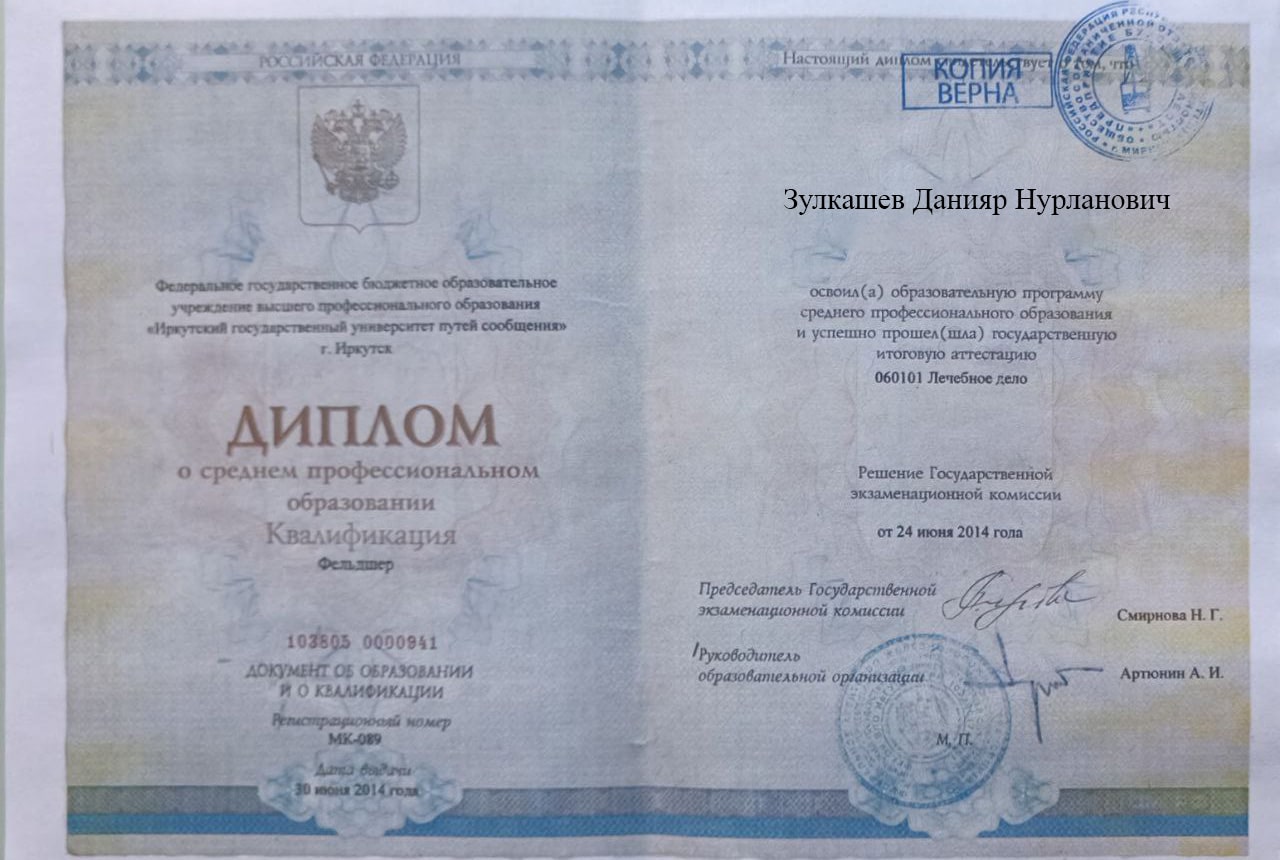 Меня зовут Зулкашев Данияр Нурланович, я — фельдшер выездной наркологической бригады в наркологической клинике "Плюс" в городе Южа. Я стремлюсь помогать людям, оказывая квалифицированную медицинскую помощь в самых разных ситуациях, и верю, что каждый пациент заслуживает внимания и поддержки на пути к выздоровлению.